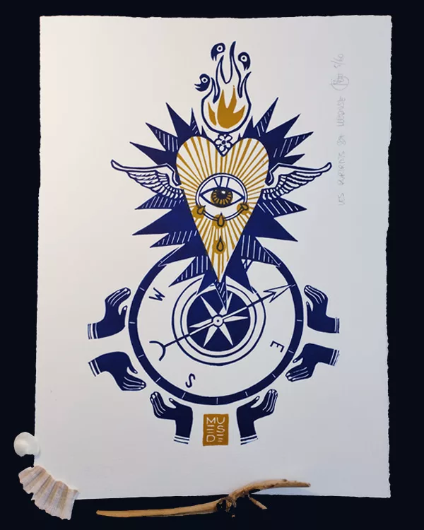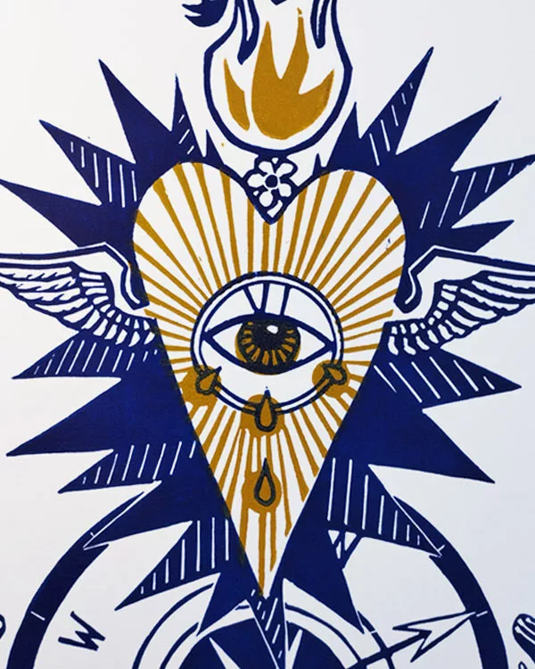 Cette linogravure illustre le Cœur sacré,  allégorie de l’Arcane VI du tarot de Marseille « l’Amoureux »