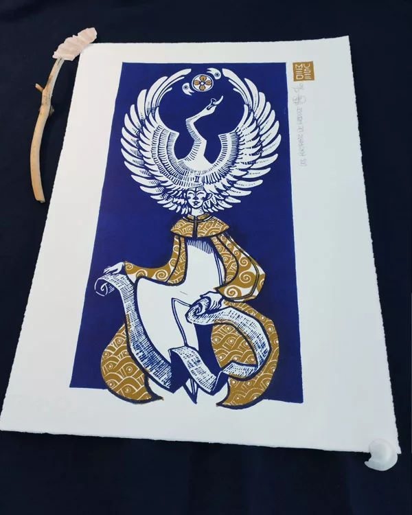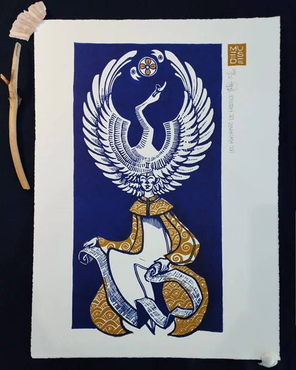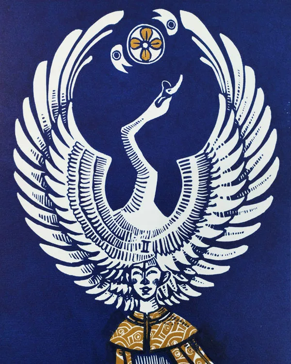 Cette linogravure illustre le Cygne du Destin, allégorie de l’Arcane II du tarot de Marseille « la Papesse »