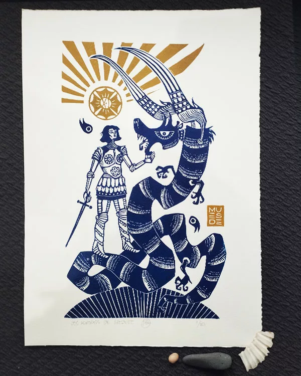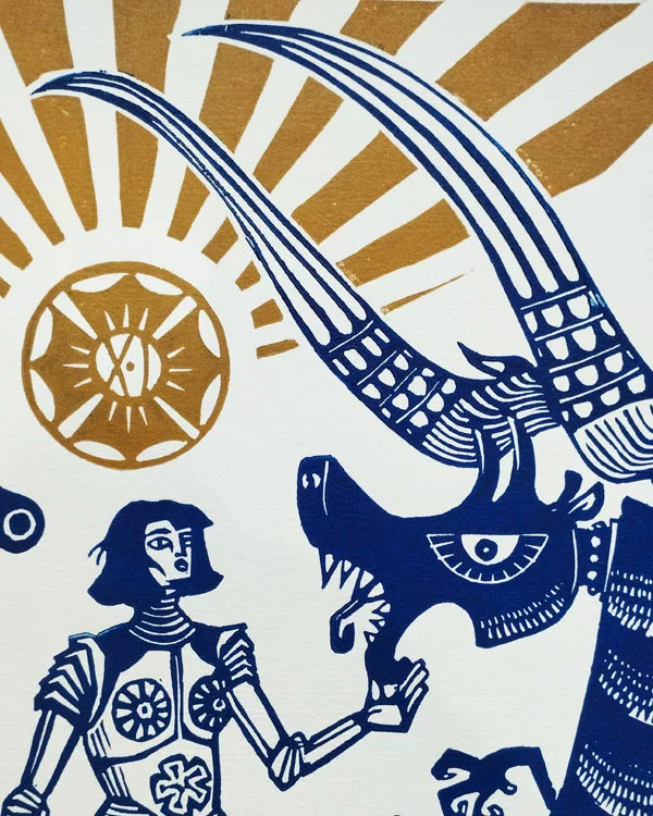 Cette linogravure illustre le Dragon, allégorie de l’Arcane XI du tarot de Marseille « la Force »
