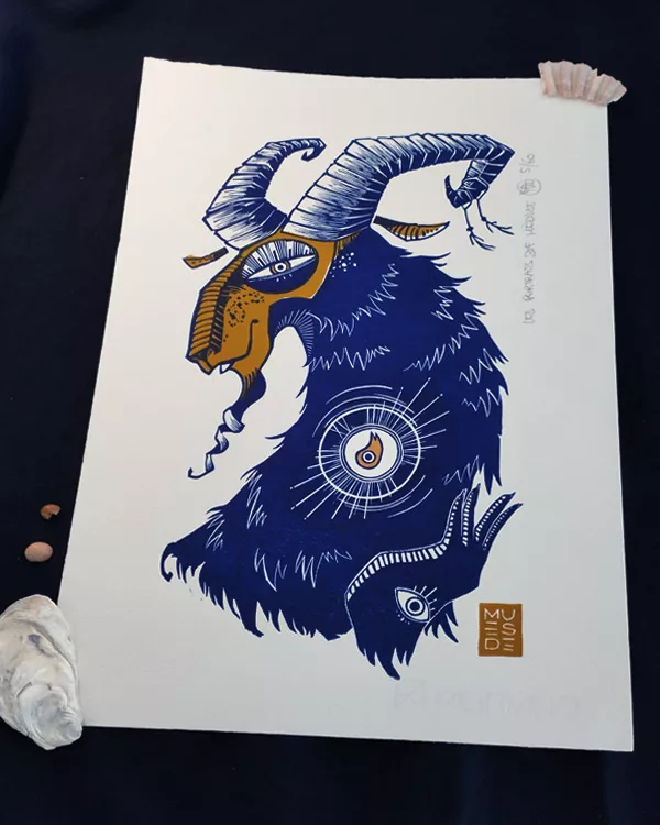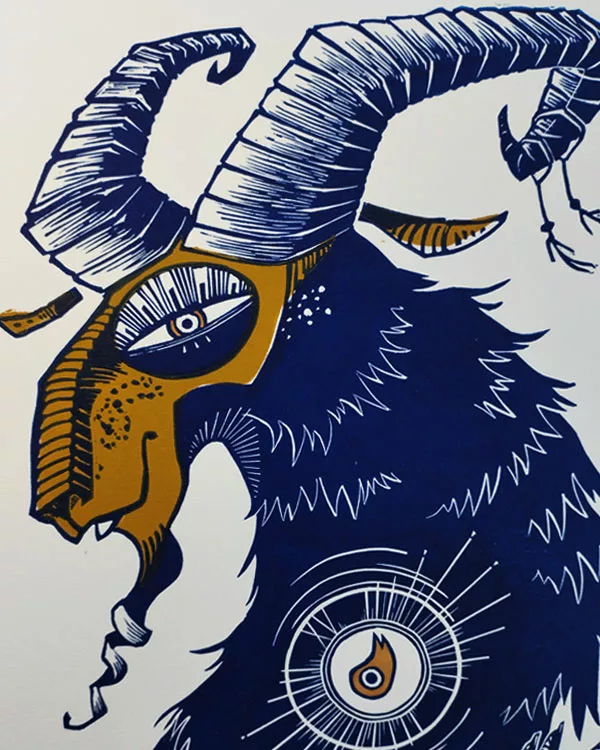 Cette linogravure illustre l’Astre lumineux, allégorie de l’Arcane XV du tarot de Marseille « le Diable »